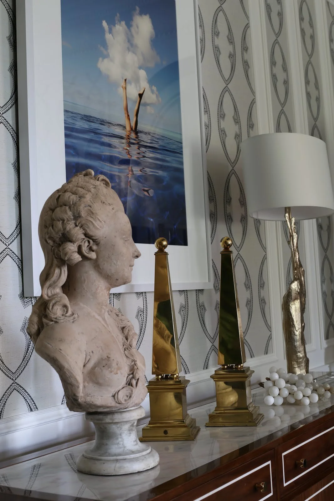 Mixing Art: Modern photography with antique busts. The perfect juxtaposition of style but reminds you of well collected home where the owner has added things throughout the years. Each item full of memories of the purchase or an event.