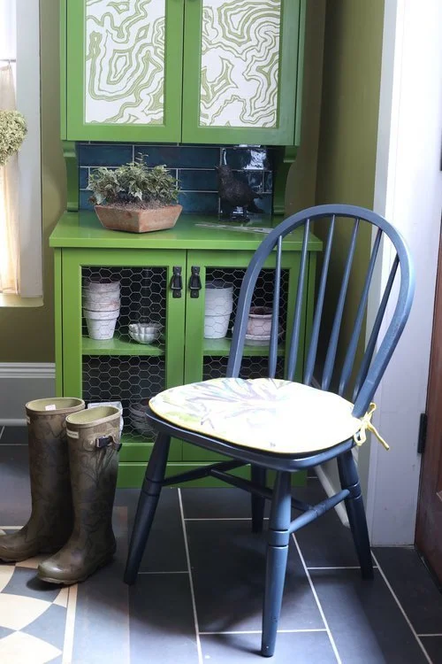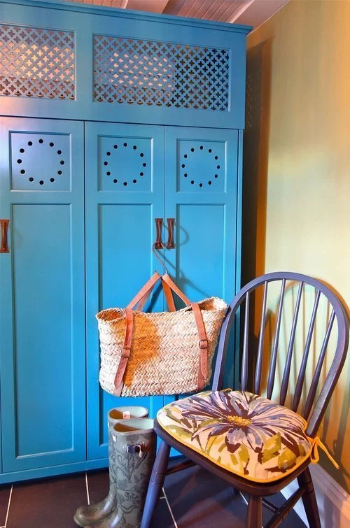 I love to find ways to add color without having it all on the wall. In this room I added functional built ins in our Bridget Beari Colors. The lockers are Dewey and the potting cabinets are Biba from our Exotic collection with the addition of some Bridget Beari Papers Buscemi in grasscloth for the fronts of the doors.