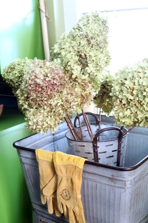 I also found the perfect English garden tools, white washed some terra cotta pots, clipped and dried some hydrangeas. What a perfect space for working on arrangements or drying bulbs. Even the floor was new with the tile from Crossville Tiles called Notrious was the perfect choice - dark with a large scale to make the room bigger and hide dirt.