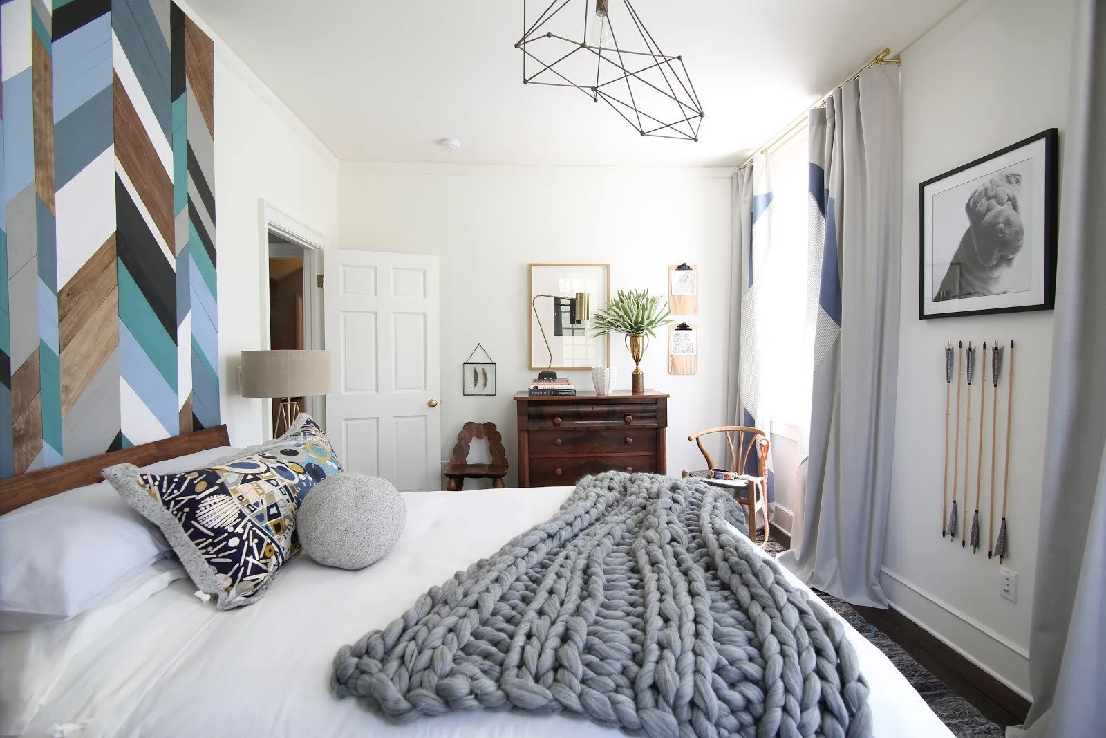 You can see some Scandinavian influences in the design through the use of texture and materials. I wanted to create a room showcasing our Bridget Beari Colors paint but do something more creative than paint a wall so I designed this wood headboard in 5 of our Bridget Beari Colors - Rambo, Maddy Tingy, Caesar, Beebop, and Snowball. It became the anchor for our design.