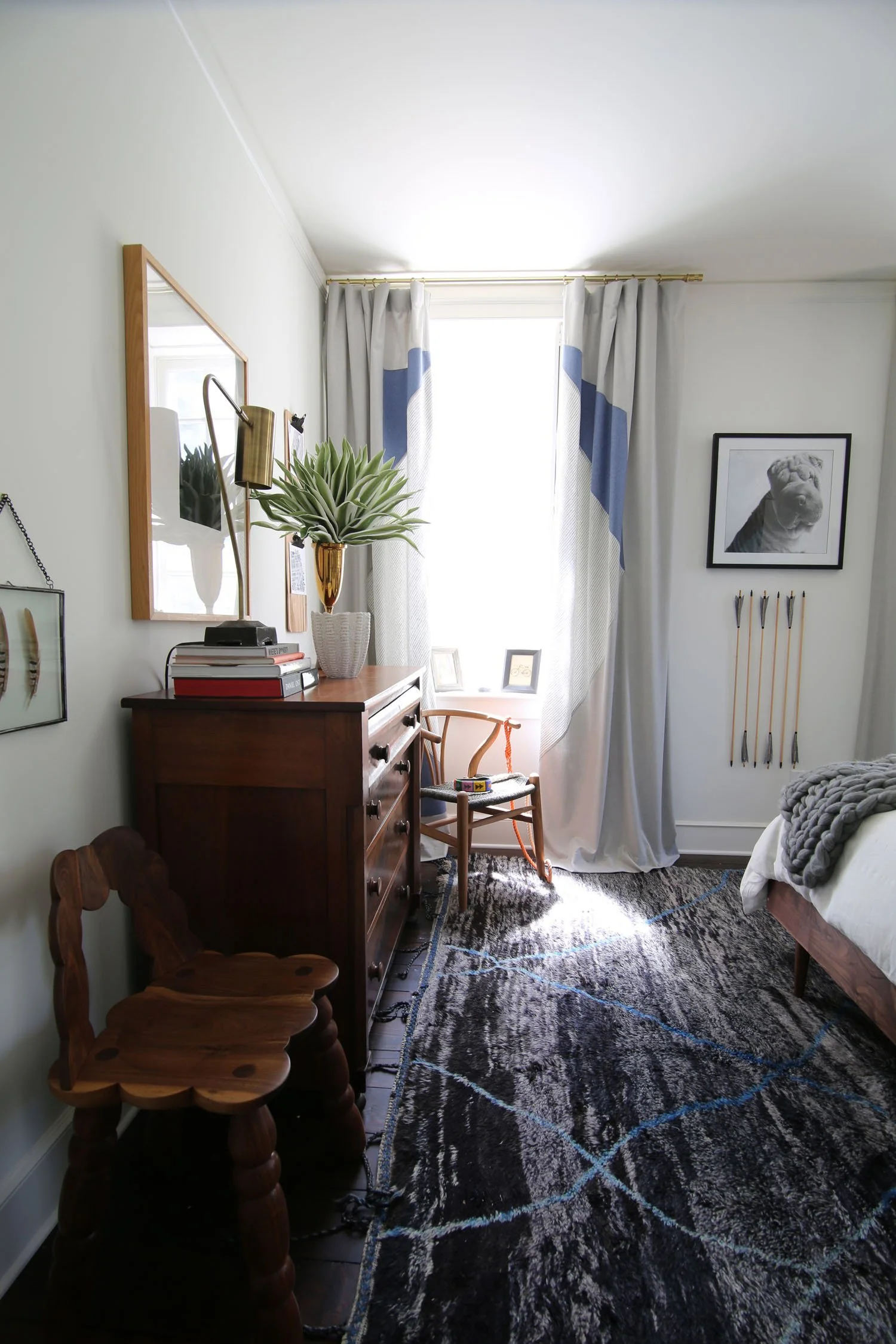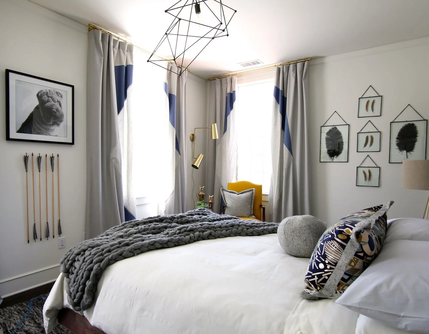 Following the geometric shapes of the headboard came the off centered light fixture - again with space voids. You can also see from this angle the wool draperies are made of 3 different patterns sewn together to create a trapezoid shape when the two panels are closed together.