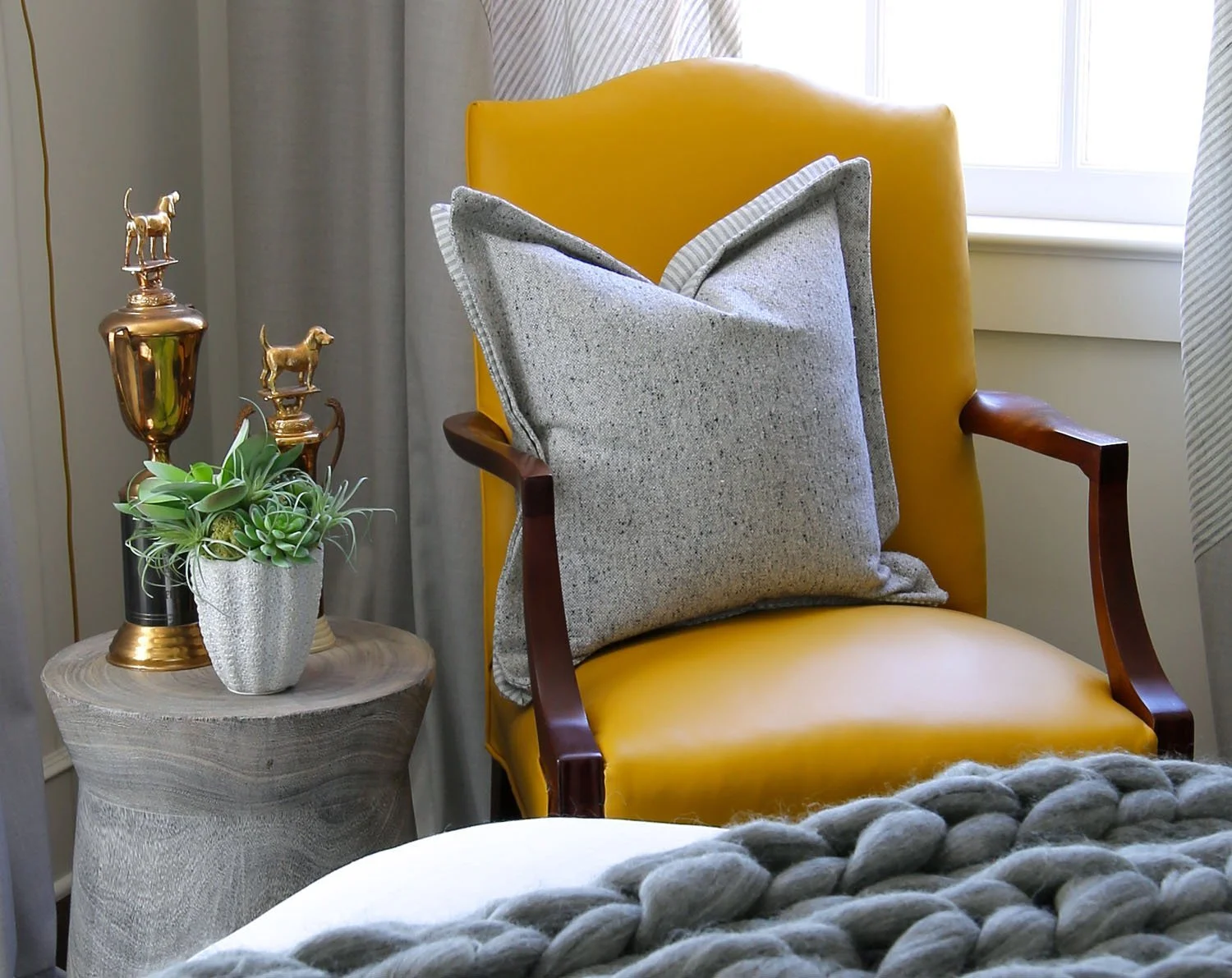 Adding the pop of yellowrod leather gives the room energy as well as nod to antiques. A home that has collected items and history.