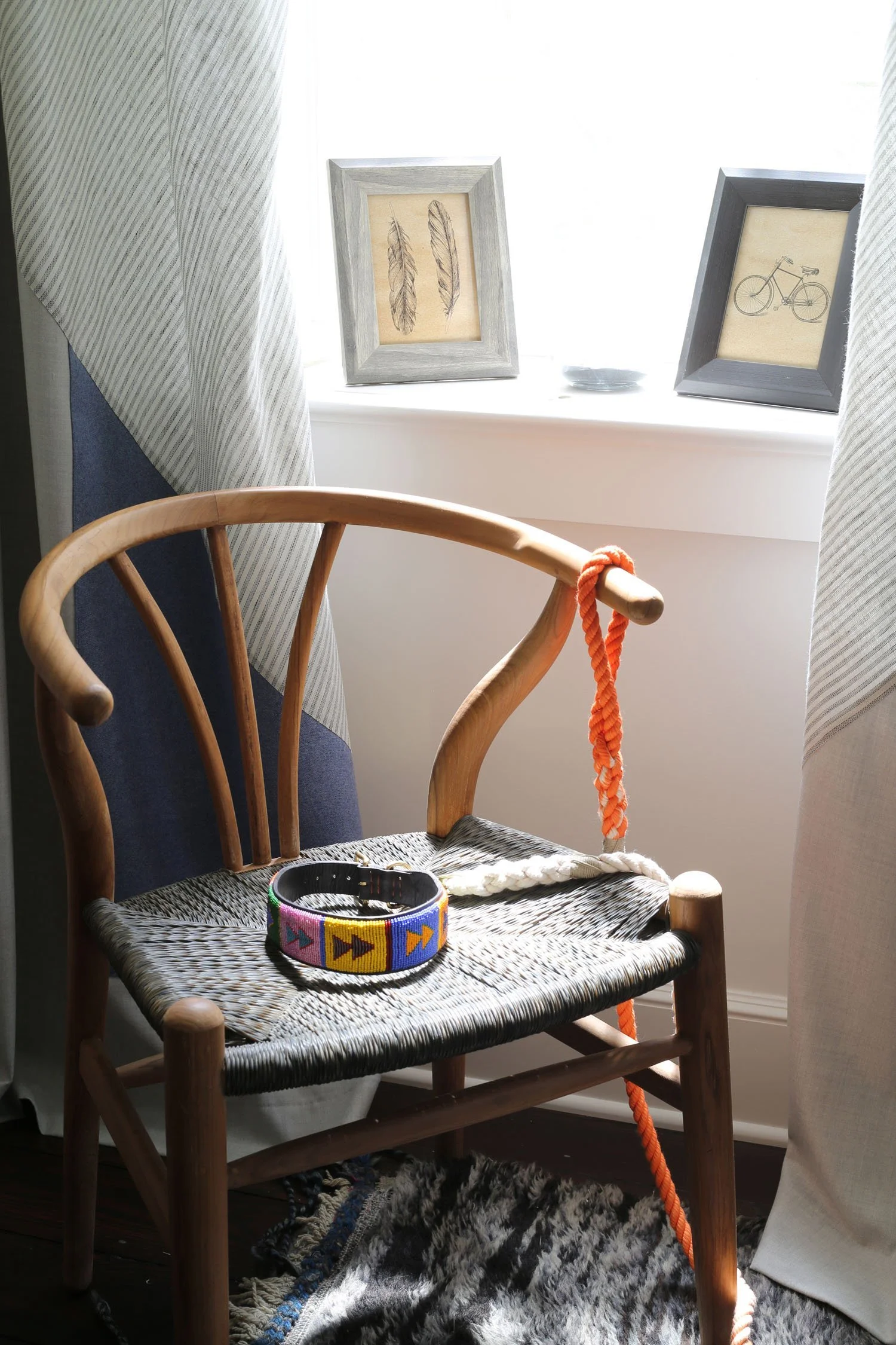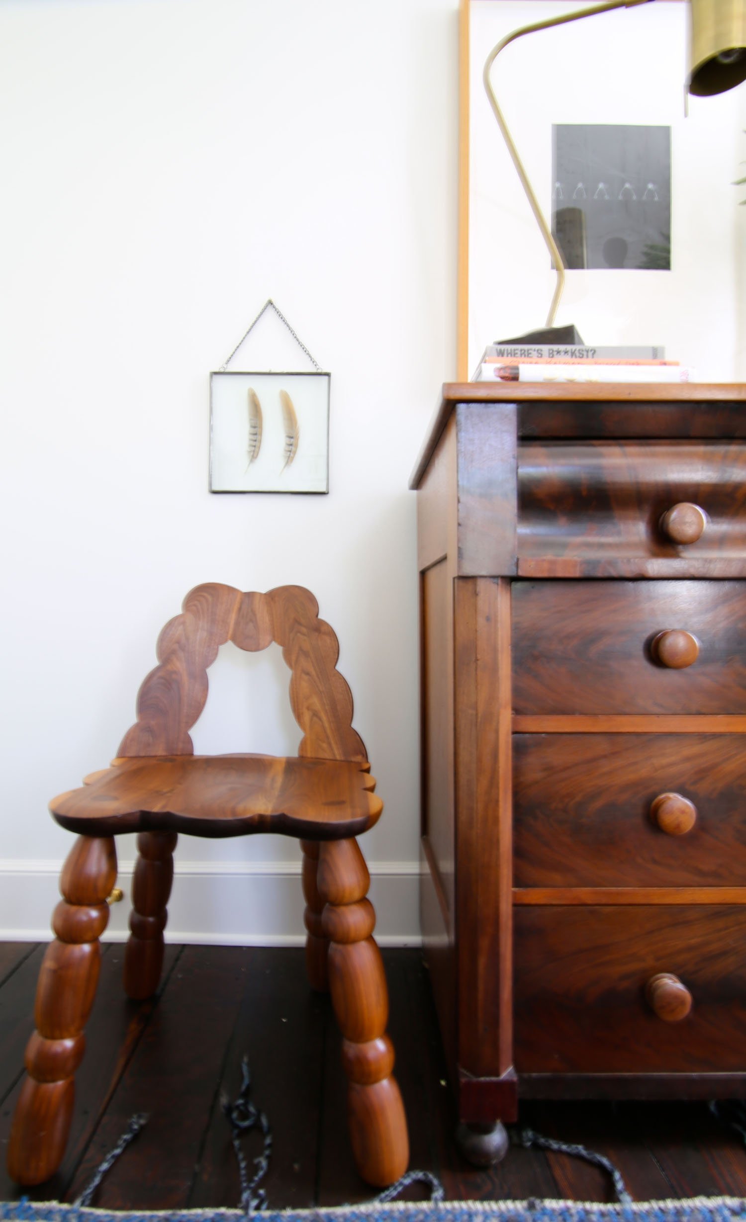 From the headboard came handcrafted items from Tate Pray, a Charlottesville craftsman who made the bed and the Poof Chair in Walnut. A beautiful and simple design that coordinated so well with the antique chest and leather chair.