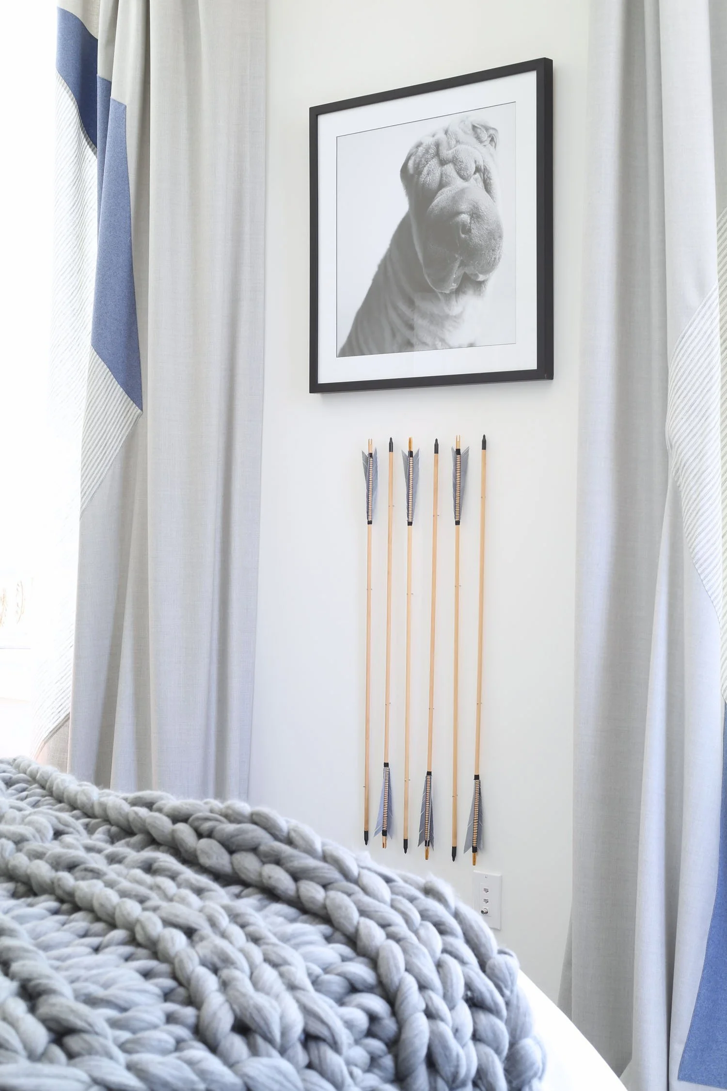 The Pierre Frey sham was the perfect combination of shapes and colors to accent the bed and the round ball Designer Guild wool a perfect distraction from all the angles.