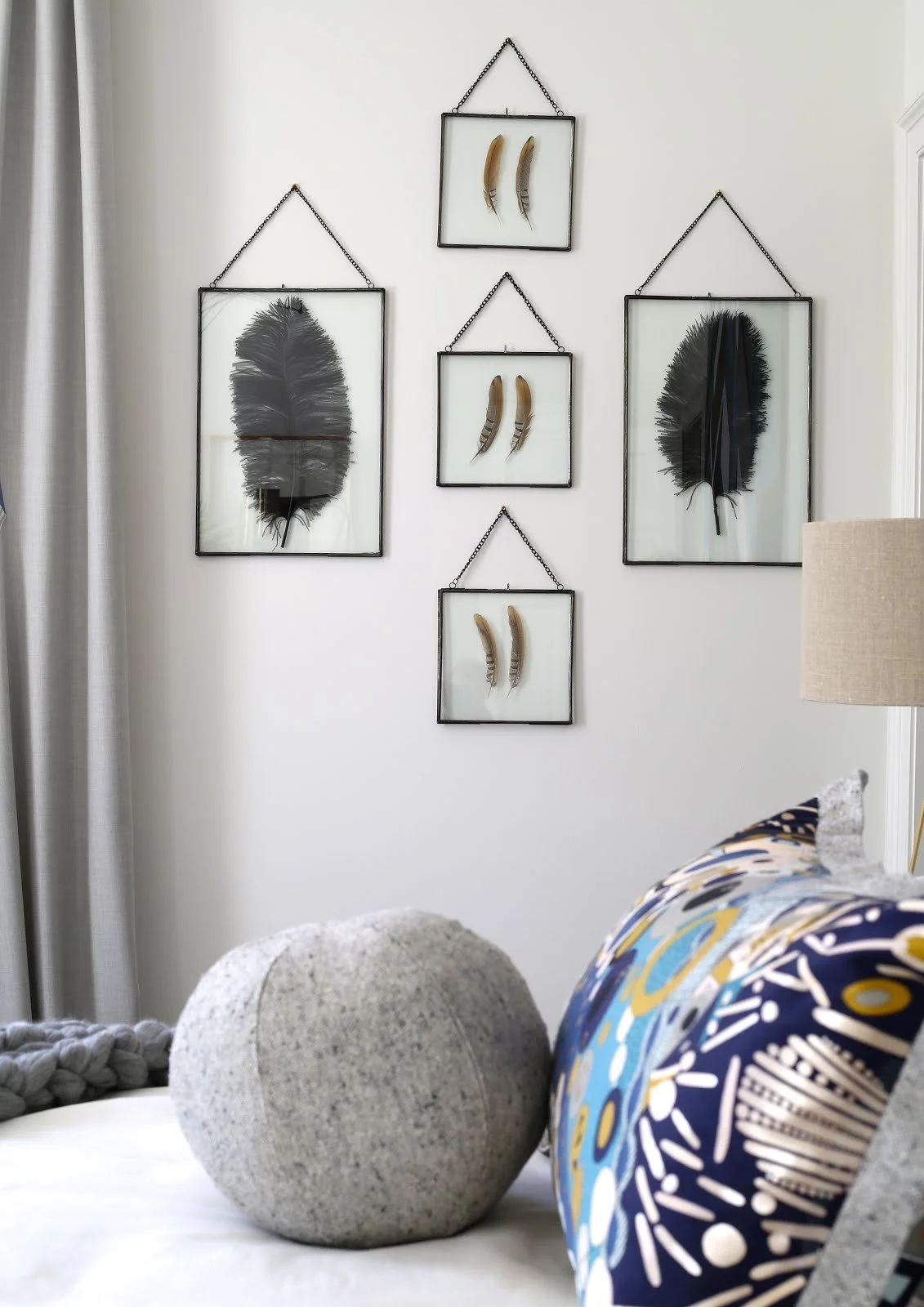 Black iron frames of feathers seem to float on the white walls.