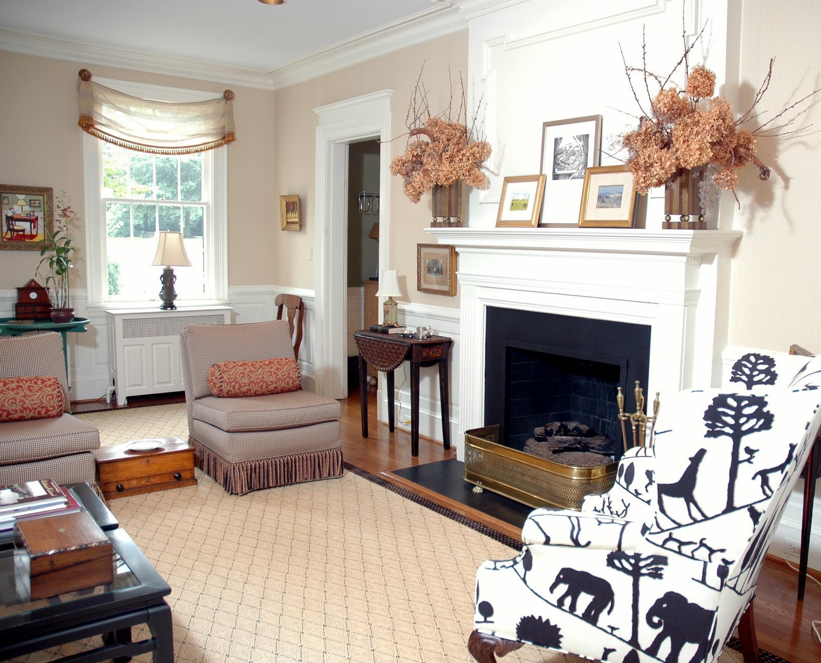 By painting the wicker sofa black, I continued the black and white scheme and the black paint also helped to anchor the room. The slipper chairs are upholstered in a tan and black check. This continues my black scheme but I am softening the white with subtle shades of cream and khaki. Khaki walls and sheer silk linen draperies complement the graphic pattern of the print.