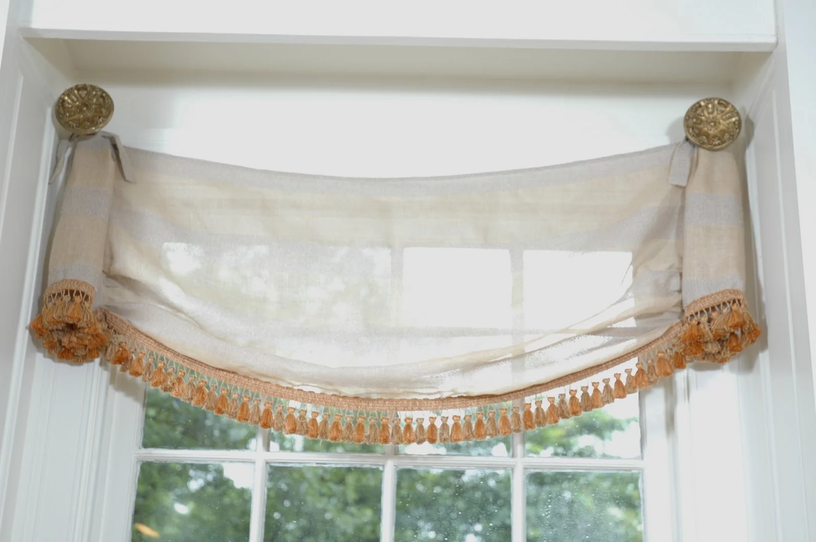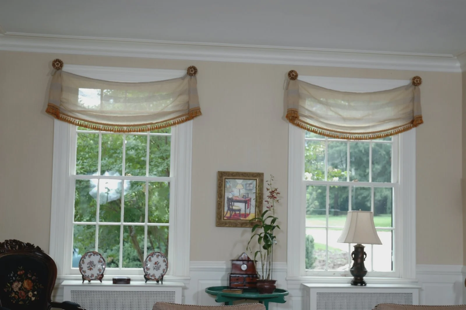 The drapery tiebacks were made from a plaster mold. The client had 2 from an aunt. We loved them and had them copied to be used as tiebacks. The treatment was soft and light. I thought it provided just enough coverage on the windows and gave just enough drama.