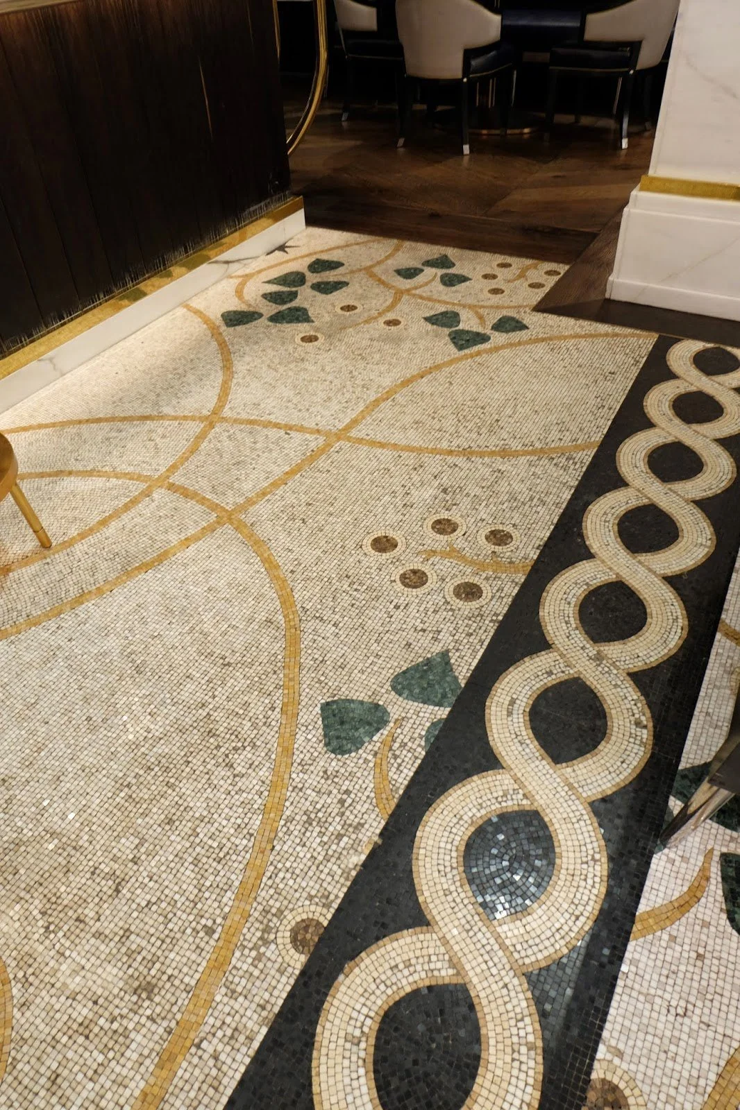 2. The Attention to Detail - Beautifully crafted custom mosaics on the walls and floor Notice how they are juxtaposed to the classical moldings on the walls