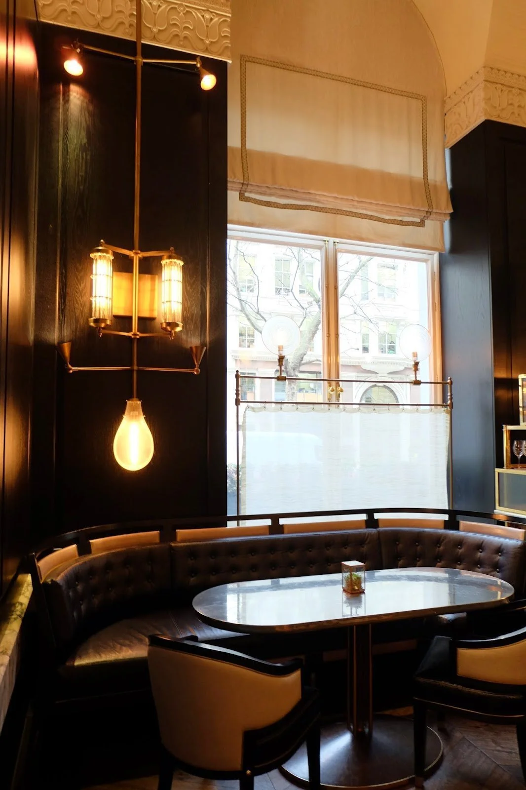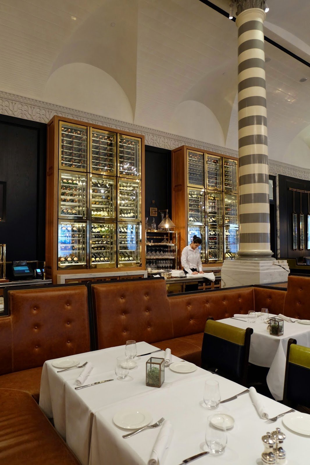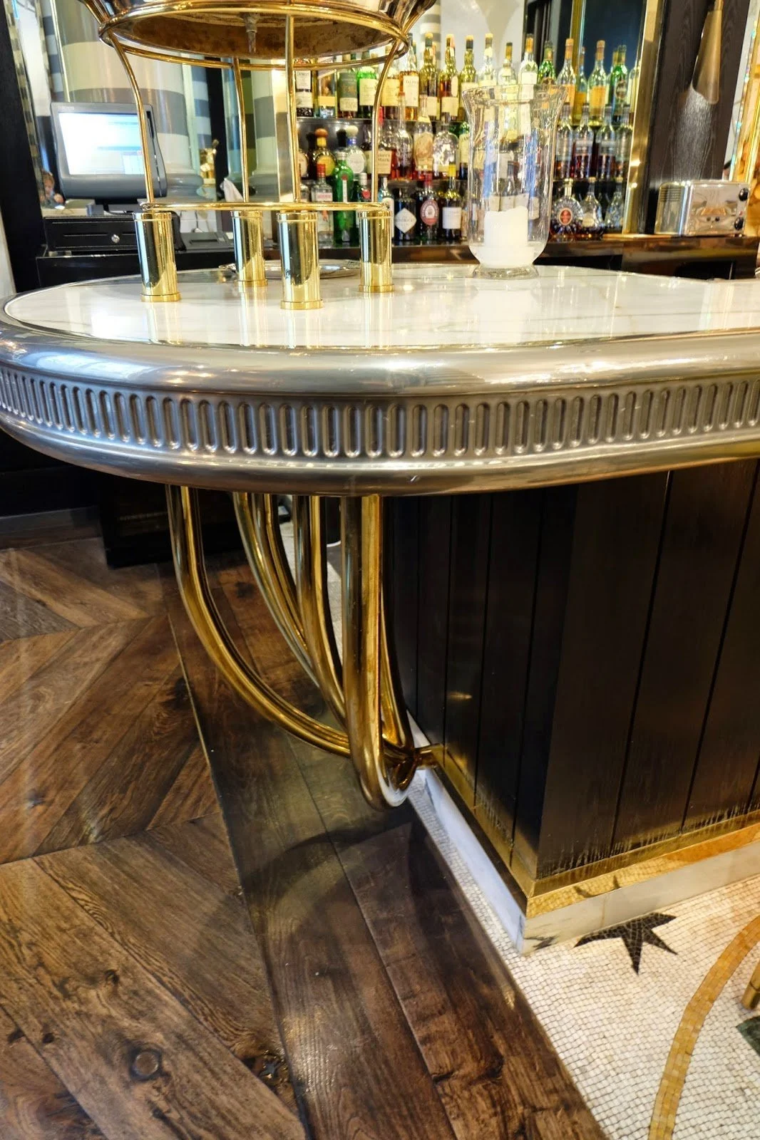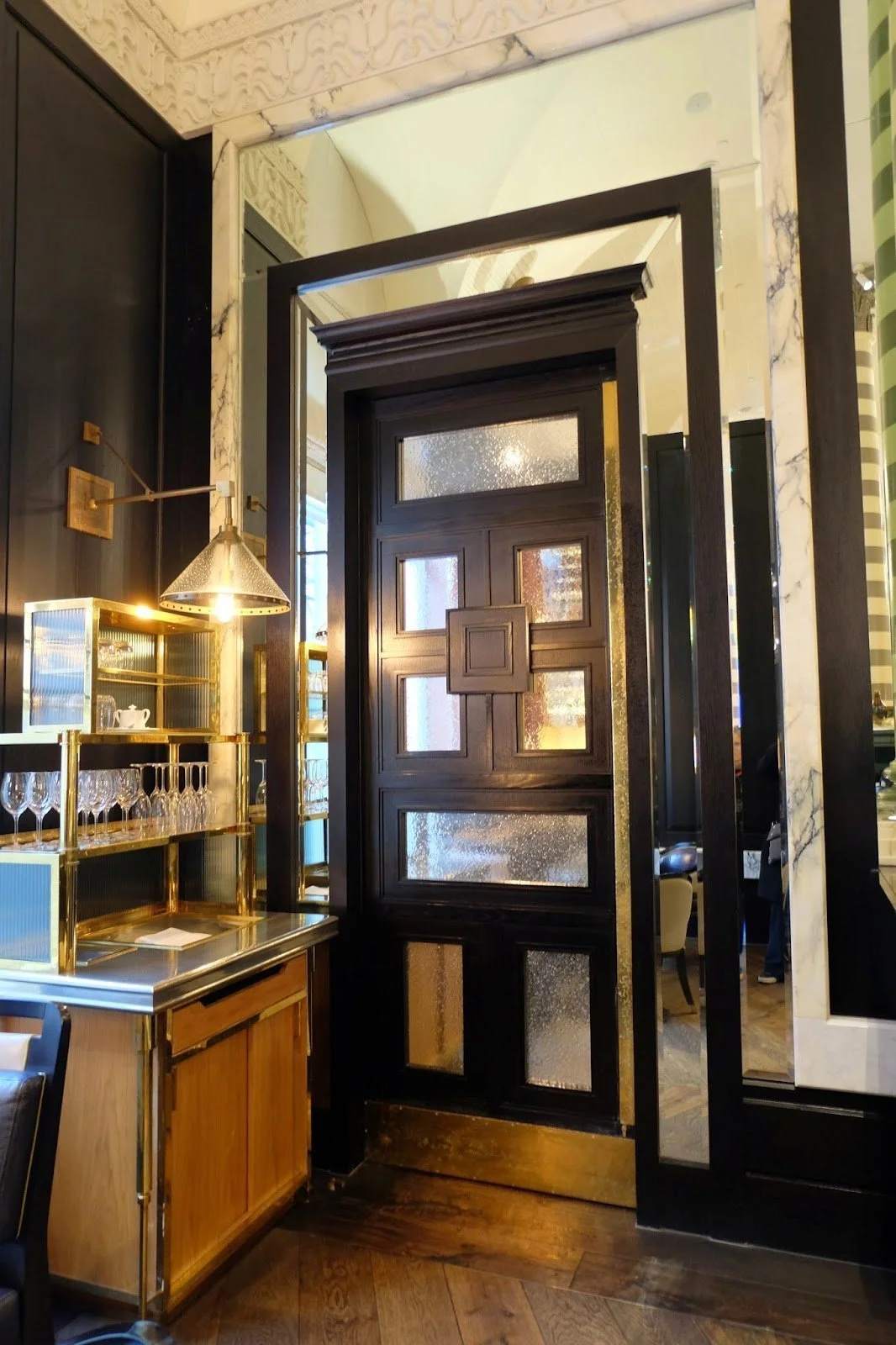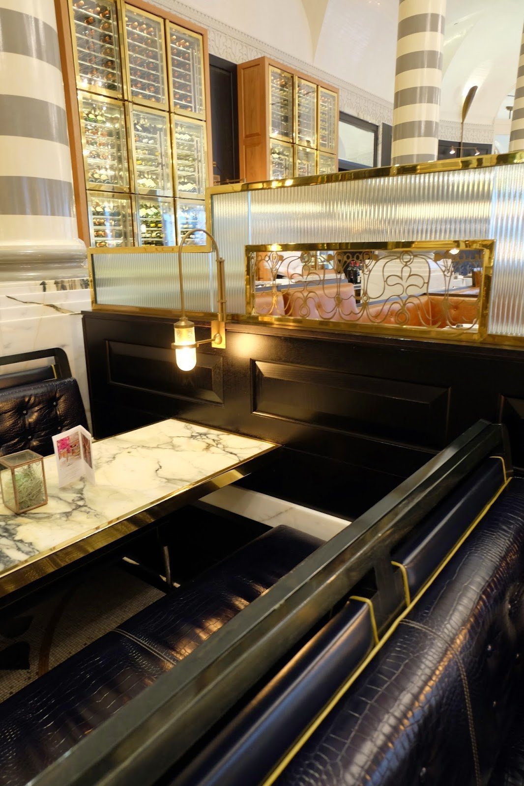 5. Sense of Textures - The shiny brass, black wood walls, tile, gloss striped columns, soft leather and the zinc bar. I love the mixture!