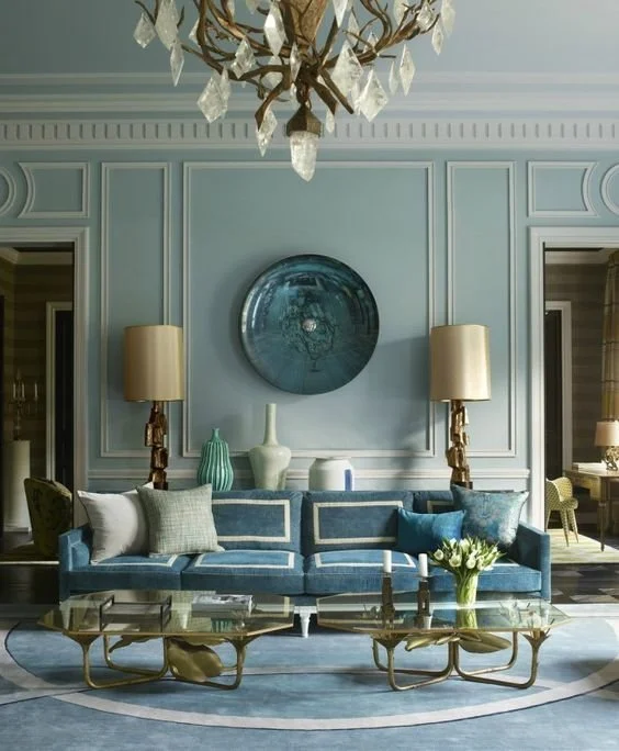 The room is symmetrical with 2 lamps, 2 sofas, 2 tables but it does not feel stagnant. By using the 3 pieces of pottery on the back console your eye looks at the green pot then the strong blue small pillow that pulls your eye from the glass sculpture on the wall. The shapes repeat from the circular moldings on the wall to the sculpture over the console and the rectangular picture molding repeats on the sofa flat braid. Different scales but thoughtfully placed. I also love the white accents of trim on the sofa, crystals on the chandelier and moldings. It gives the room a beautiful ice palace effect.