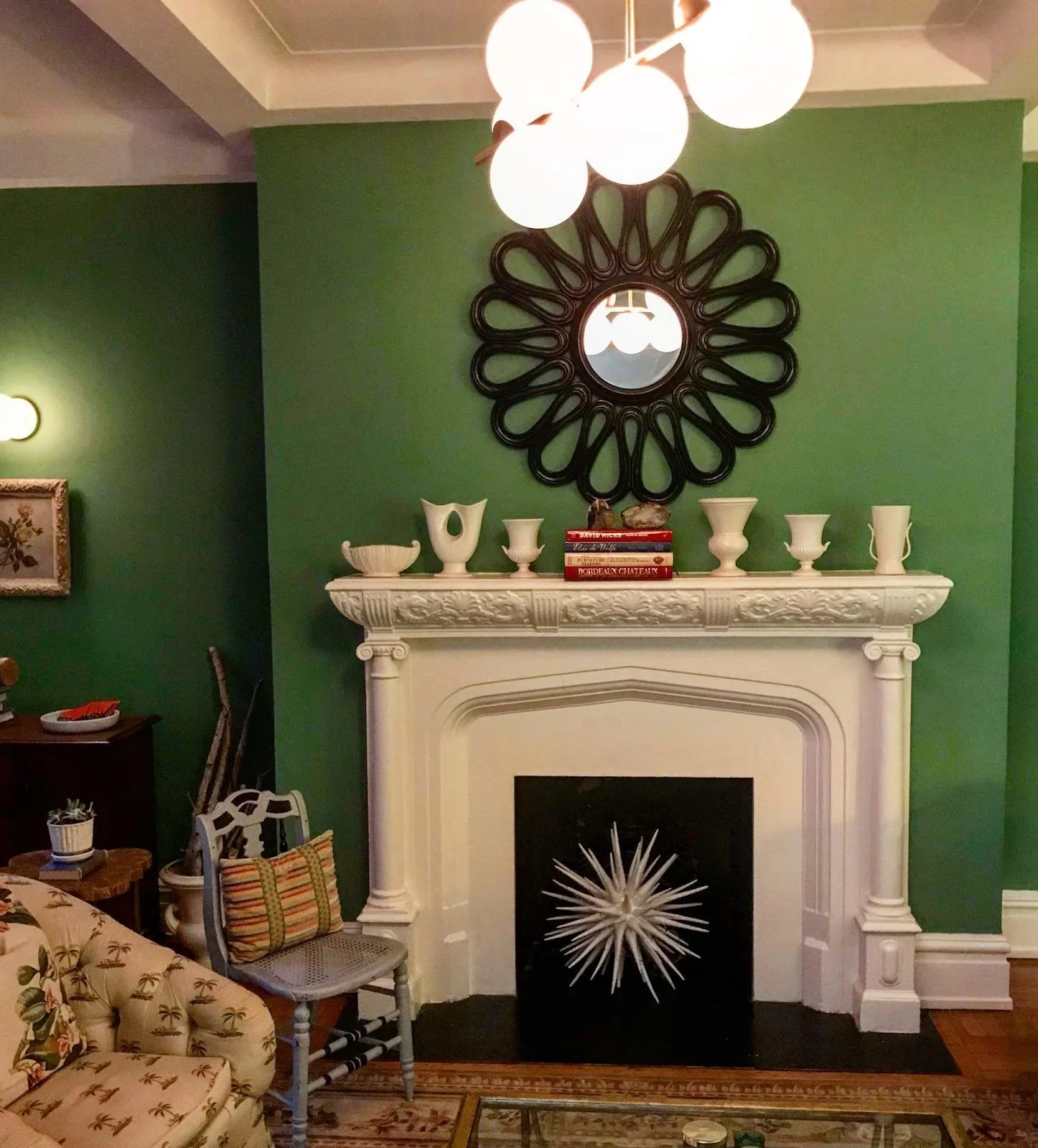 Jewel tones like emerald are a bold design statement, they are rich yet immediately create a positive energy in a home. I strongly believe in the medicinal value of color, and choosing the right hue for the space can transform the ambiance. I like to incorporate vibrant color in my designs-- sometimes as the primary color (painted walls), while other times as an accent color through the fabric choices or accessories. Emerald green is a perfect color for both uses. However, a home should not be one bright color after another, and nuanced and sophisticated use of color in a home can be tricky business, but when done right it defines the space. Combining neutrals with vibrant colors or soothing colors creates that balance. I painted my living room in New York City a rich green over 12 years and I have not tired of it! I finished off the room with lacquered white trim and fireplace and placed a black starburst over sized mirror over the fireplace. The juxtaposition of these neutrals allow the emerald color to shine. I use the mantel to display my American white pottery.