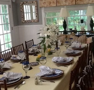 We hosted a dinner party in summer, and whipped up a fruity sangria, prepared enchiladas and served fire engine hot fresh salsa, set the table with a red white and blue with antique red lanterns lining the table, and blue hydrangeas picked from my garden