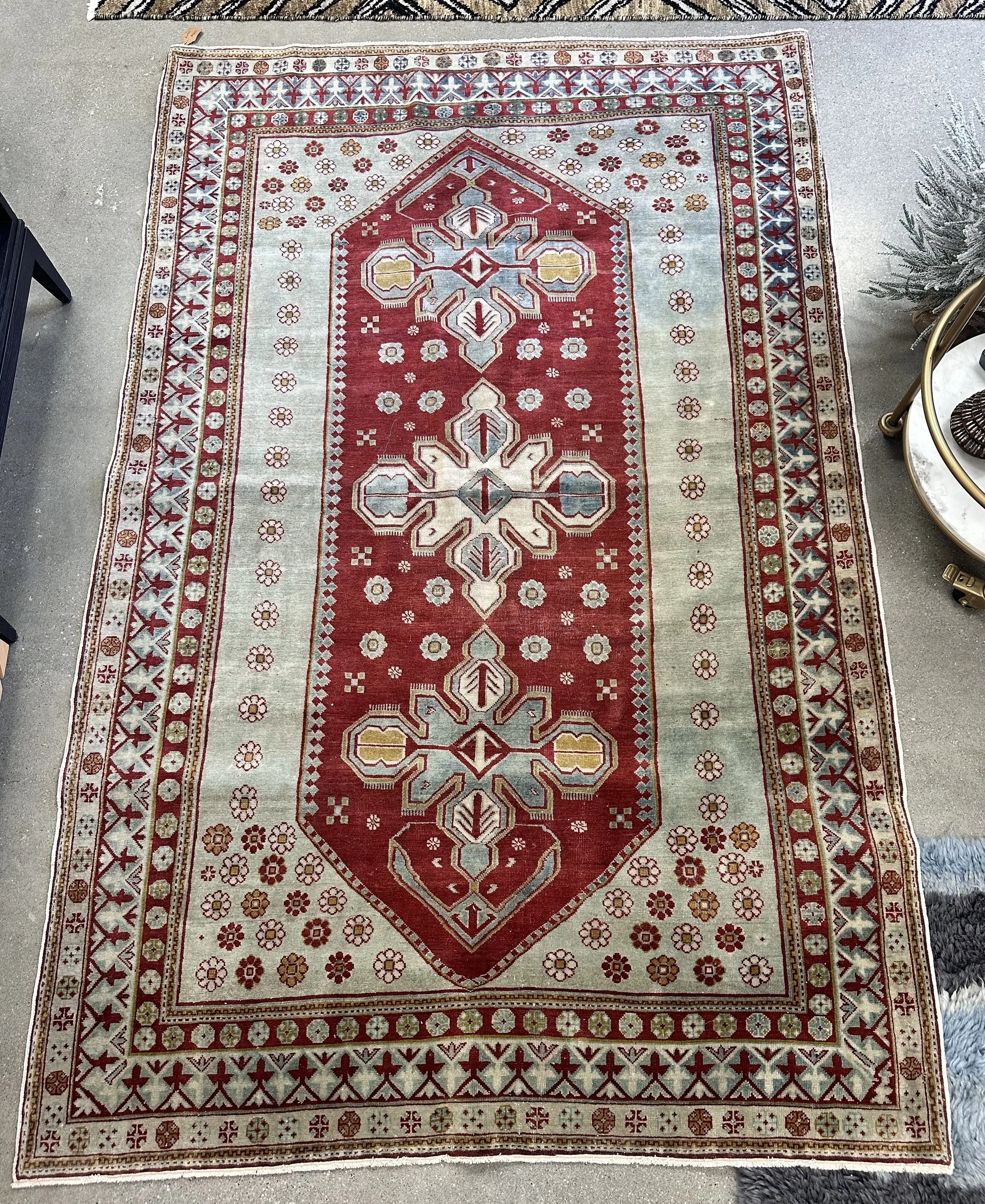 Give your space a conversation piece with this beautiful 1930’s Teal and Red Caucasian rug, from the Caucasus region. Beautifully and carefully made, this area rug will brighten any room for years to come.