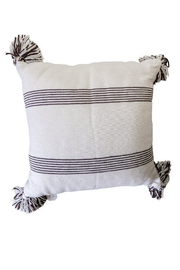 Constructed of a textural ribbed weave fabric with brown stripes and adorned simply with pom poms, this oversized pillow is ready to make a statement in your home. What that statement is will be up to you.