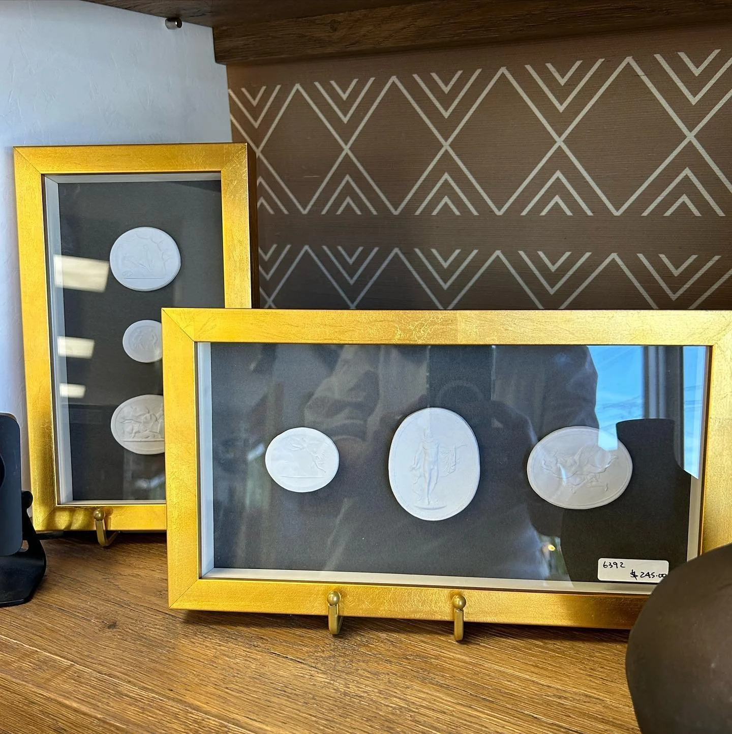 Add some dimension to your walls with our intaglio shadowbox. Three delicate classical images floating on a black background and framed in a gold frame. Classically tasteful and very interesting.