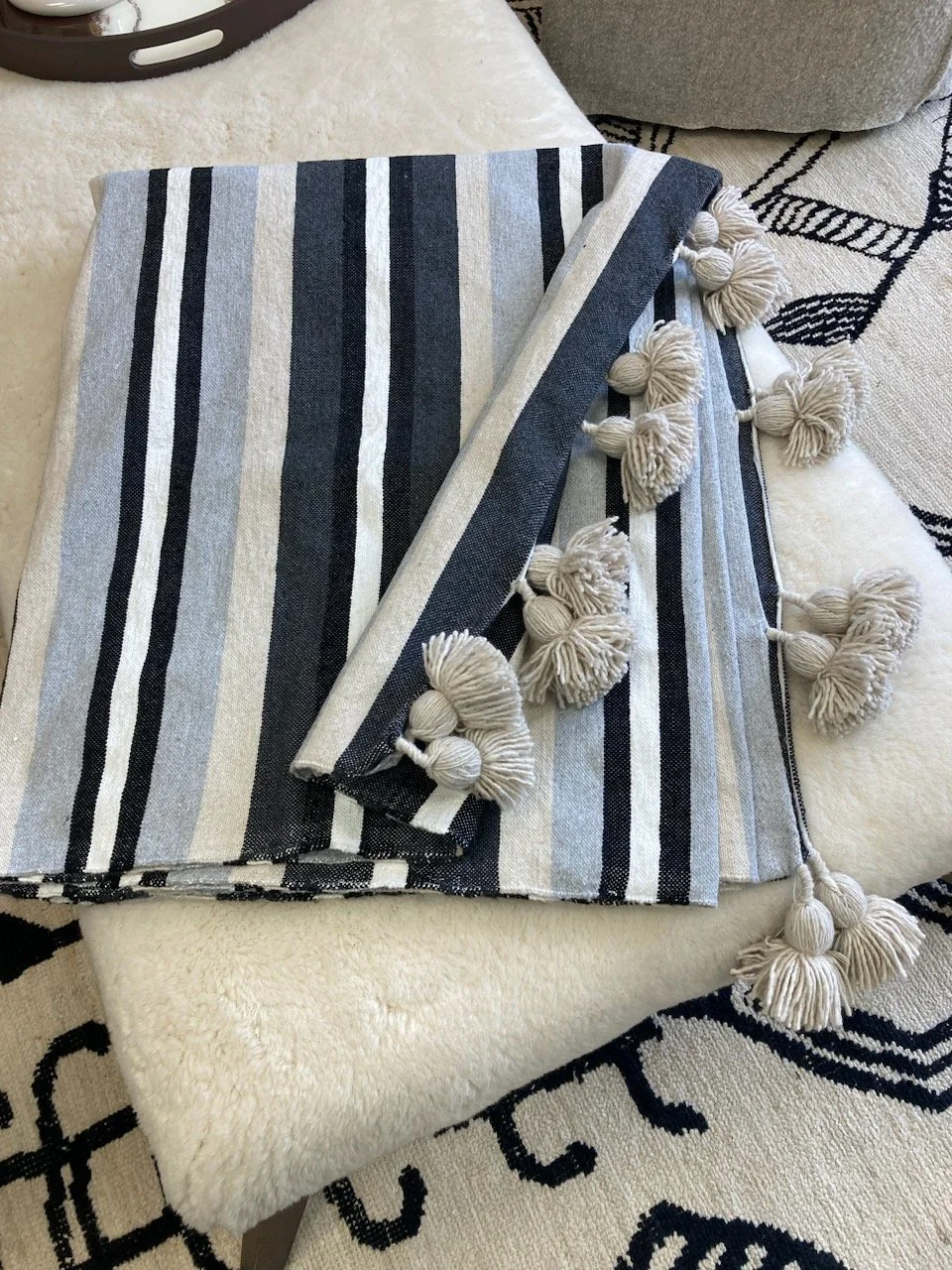 This generously sized throw sports stripes of black, white, gray and natural and is finished with natural pom poms.