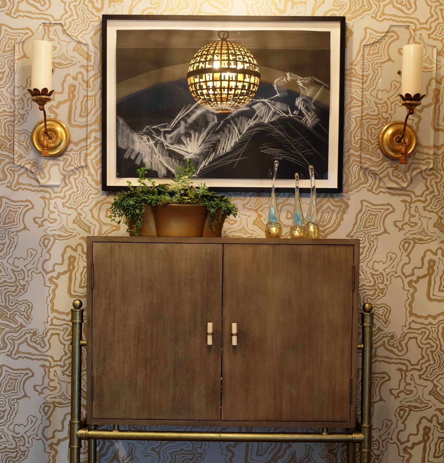Buscemi is an elegant reimagination of classic agate. Available in grasscloth, matte and metallic grounds in colorways from pale pink to bold black. Buscemi is a Bridget Beari Papers bestselling wallcovering with infinite versatility in a variety of applications beyond your walls. We've used Buscemi to cover lampshades, ceilings and furnishings as well as framed art!.