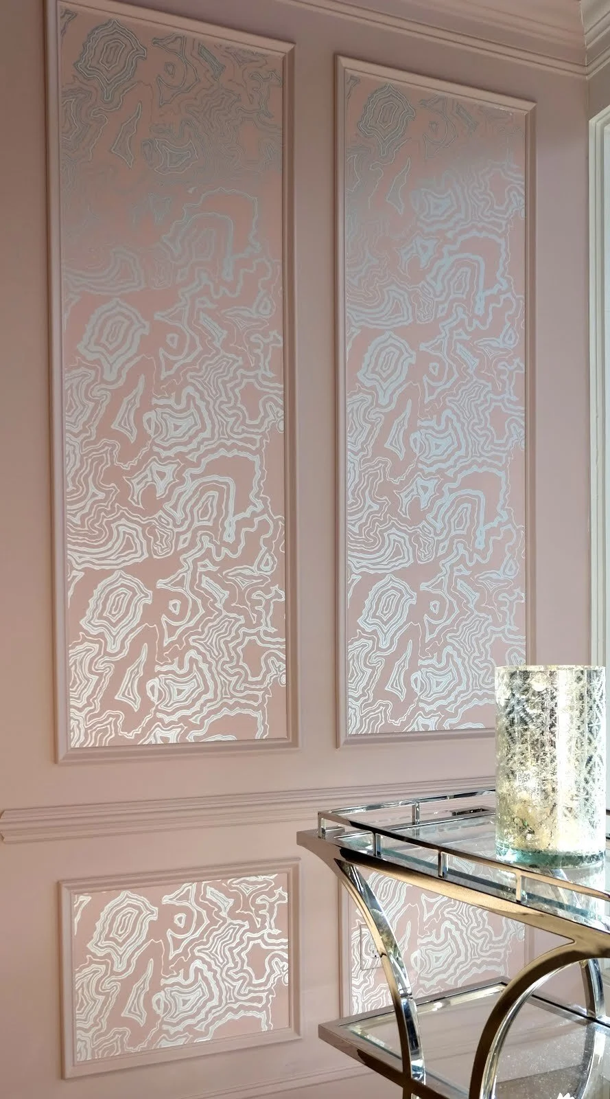 Buscemi is an elegant reimagination of classic agate. Available in grasscloth, matte and metallic grounds in colorways from pale pink to bold black. Buscemi is a Bridget Beari Papers bestselling wallcovering with infinite versatility in a variety of applications beyond your walls. We've used Buscemi to cover lampshades, ceilings and furnishings as well as framed art!.